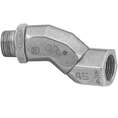 El conector giratorio OPW 45 está diseñado para aplicaciones de autoservicio de gasolina donde el fácil manejo de la boquilla y la manguera es importante para la comodidad del cliente. El 45 se instala entre la boquilla y la manguera para reducir la tensión, proporcionando flexibilidad para que las mangueras de combustible duren más.